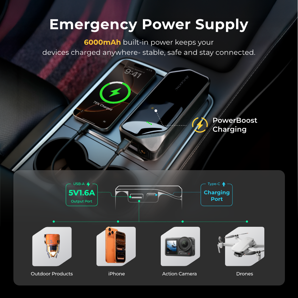 6000mAh built-in power keeps your devices charged anywhere- stable, safe and stay connected.