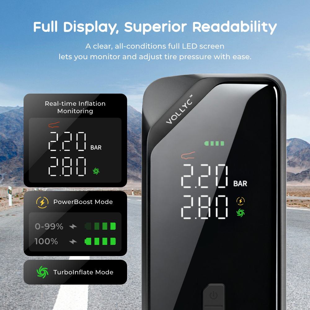A clear, all-conditions full LED screen lets you monitor and adjust tire pressure with ease.