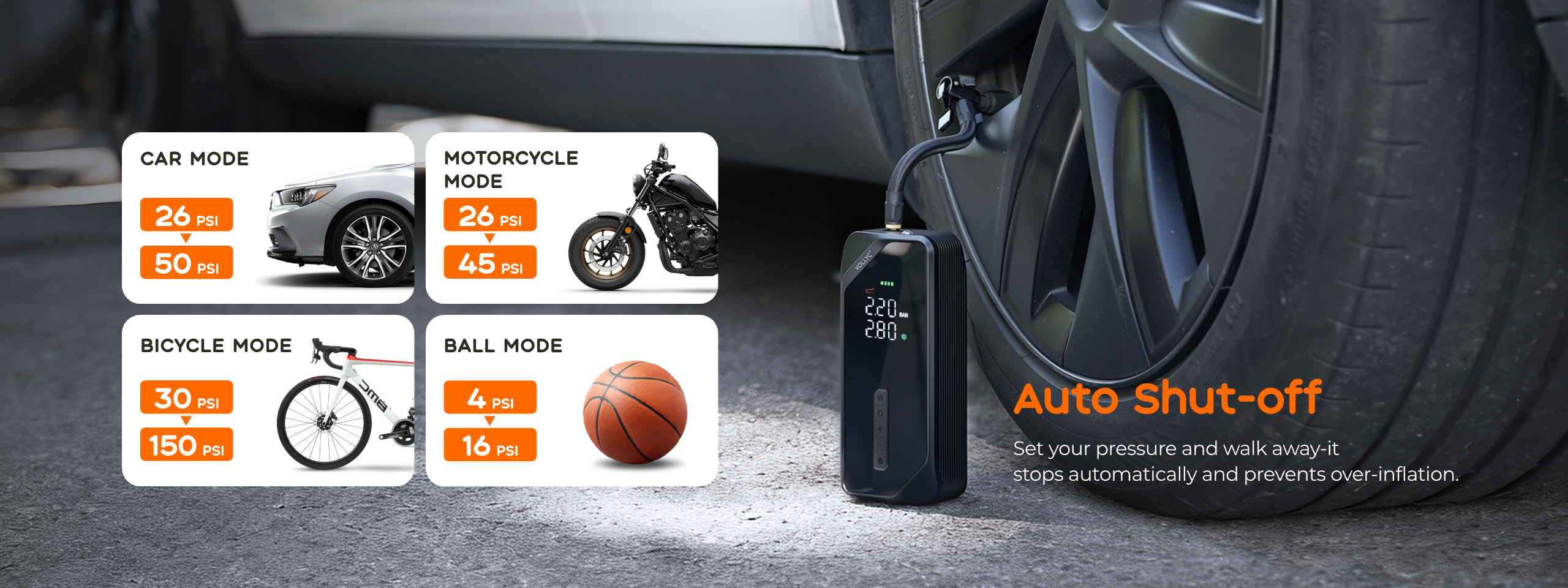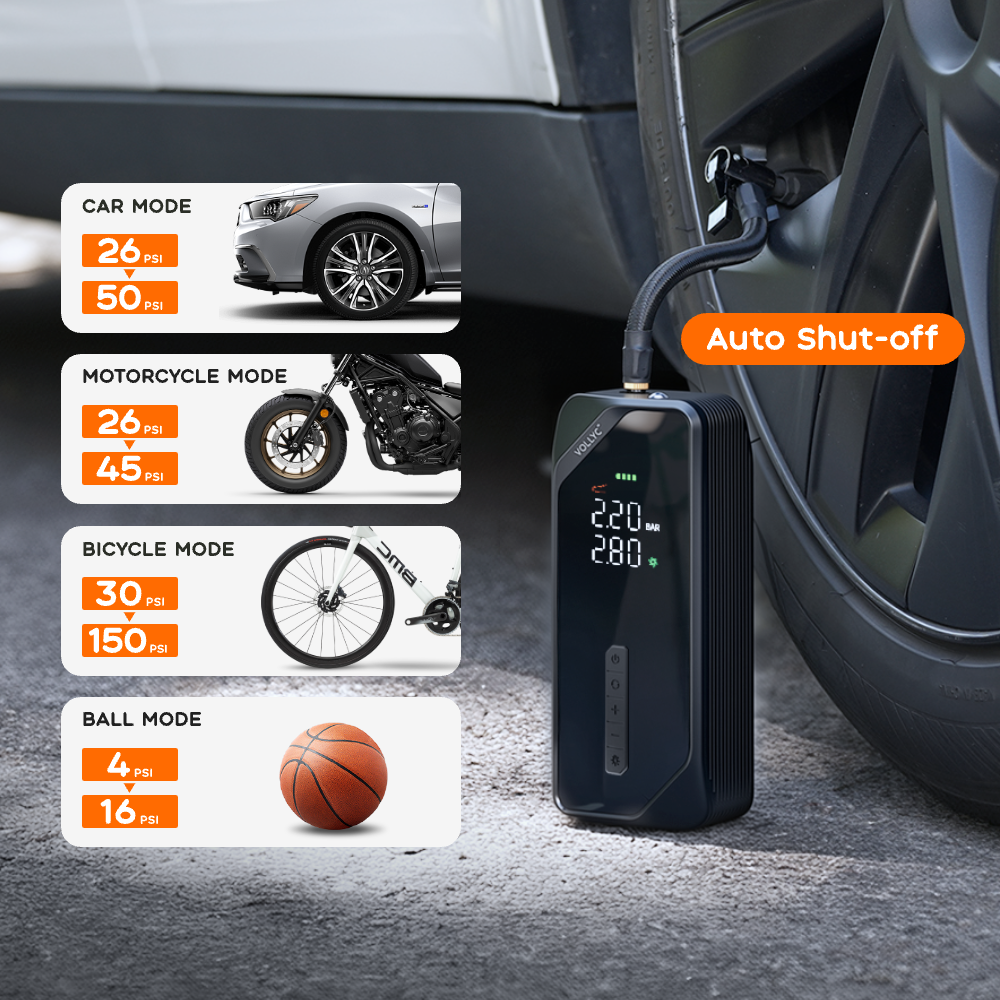 4 Smart Inflation Modes: preset for different vehicles.