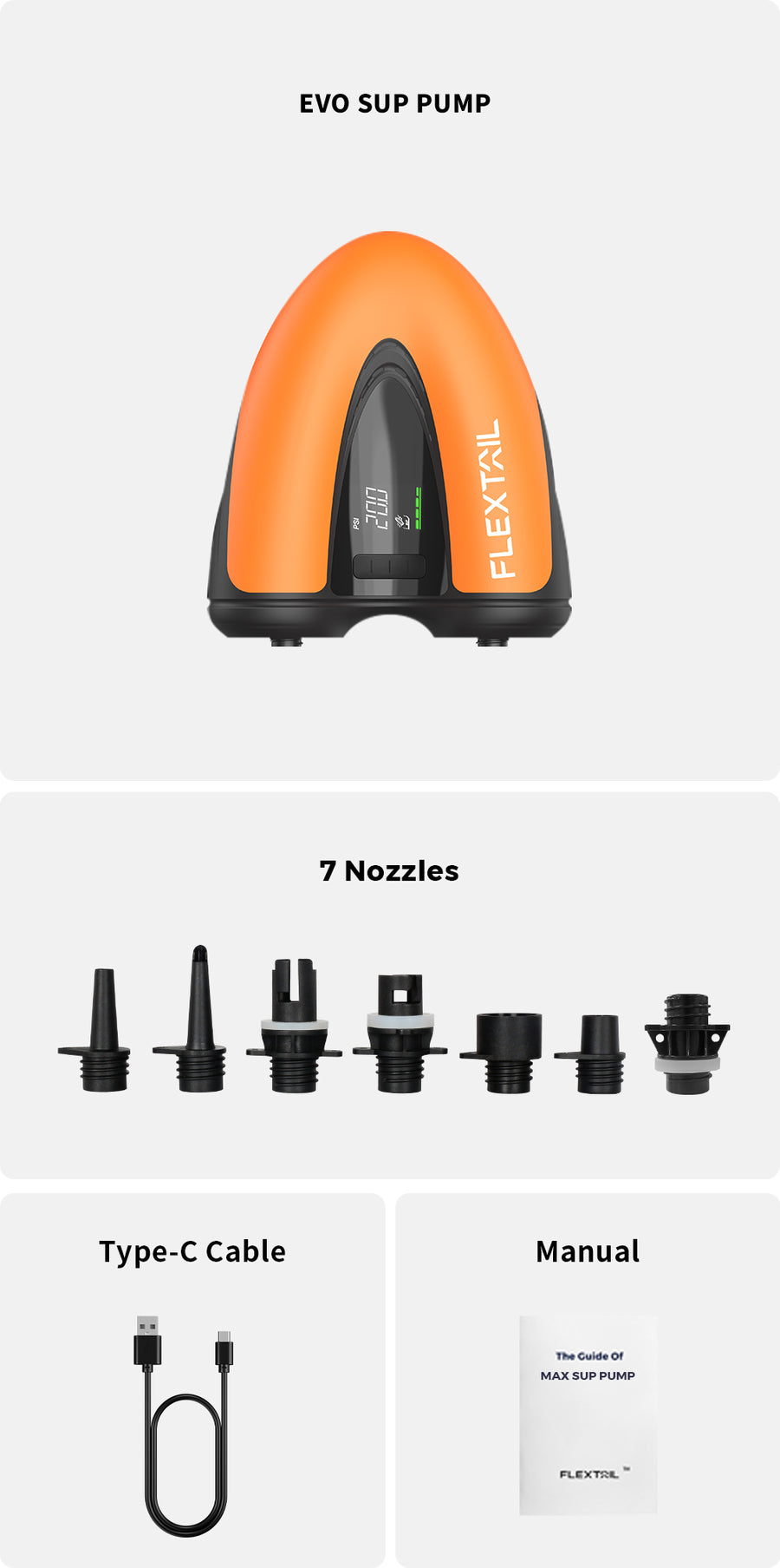 EVO SUP PUMP is an all-in-one cordless electric pump! It is compatible with almost any iSUP Board, Boat, Kayak, KITE, or air mattress! One pump is enough for all your inflatables. Make your travel easier.