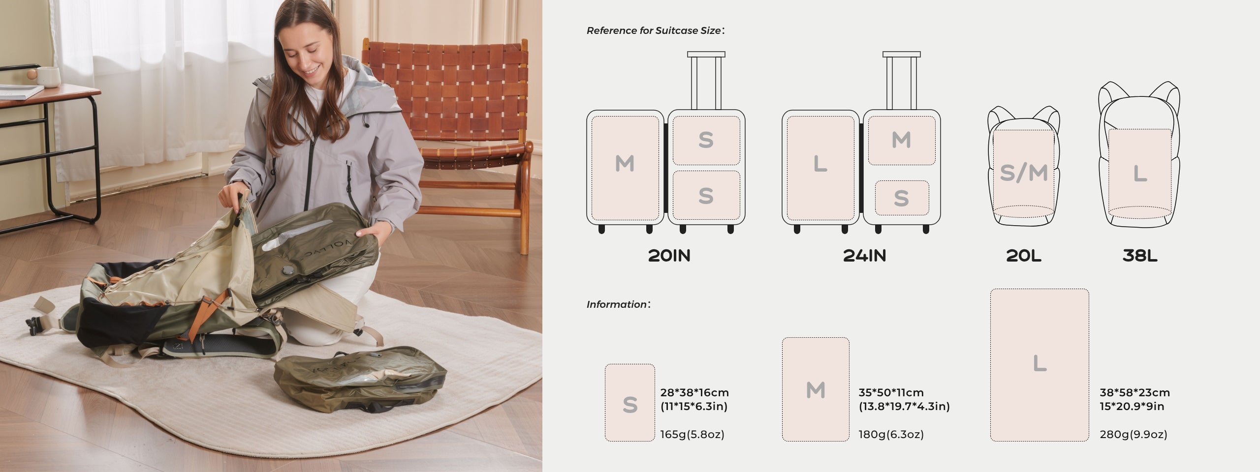 Whether it's a rolling suitcase or a hiking backpack, VOLLYC EZY SET is designed to fit them all. No awkward bulges. One system fits endless travel needs.