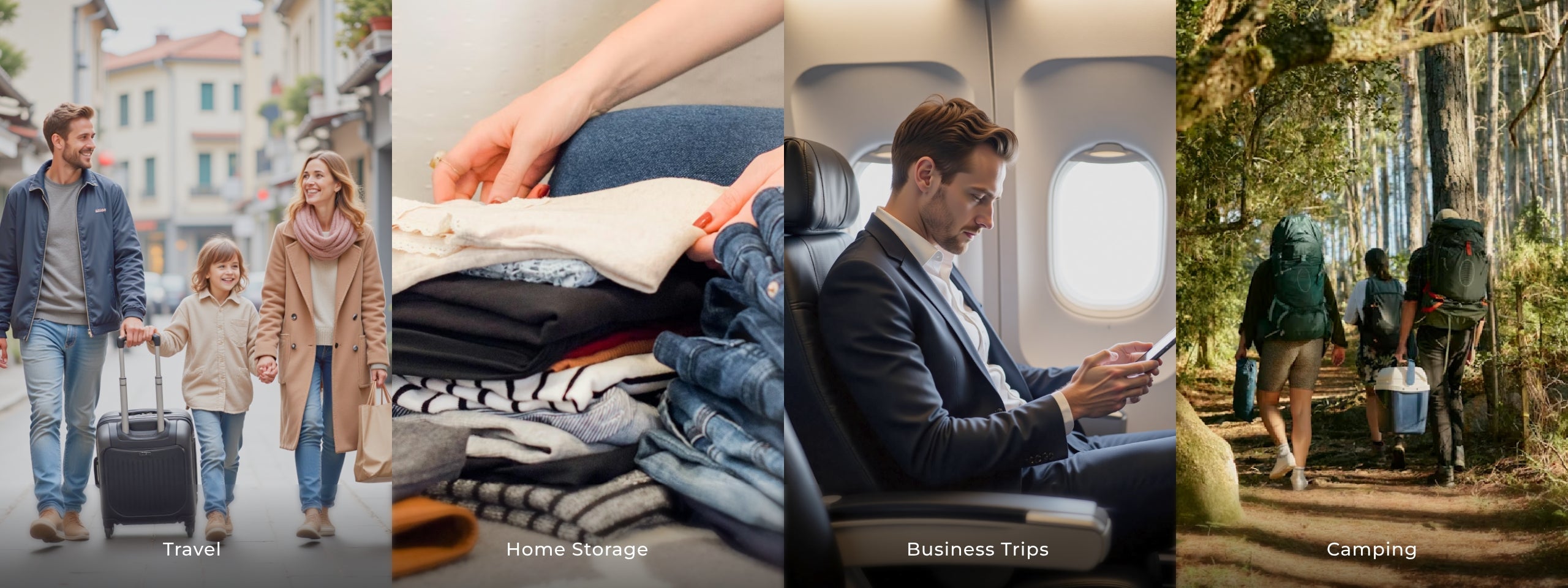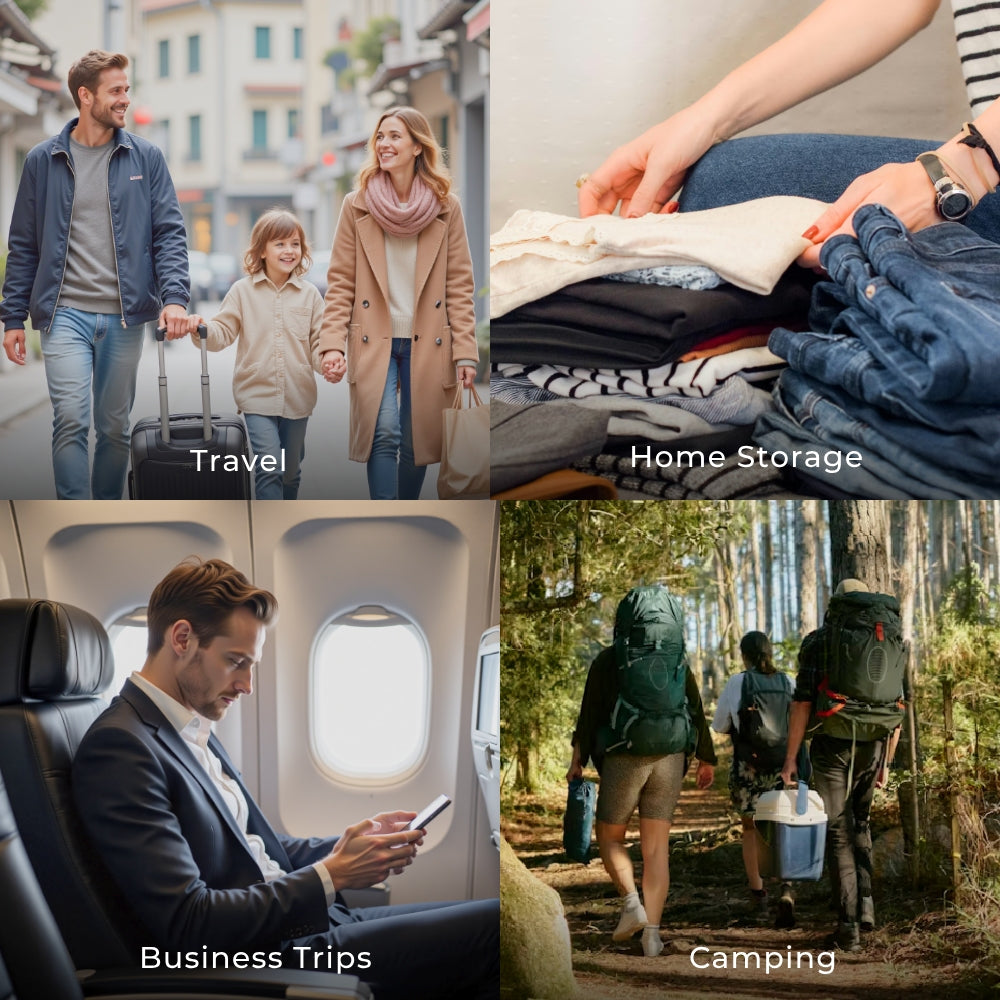 EZYPACK compresses your clothes by up to 85%, turning chaos into order in seconds, Designed to fit perfectly into any suitcase, it saves space without sacrificing what you need. Just pack, zip, and go.