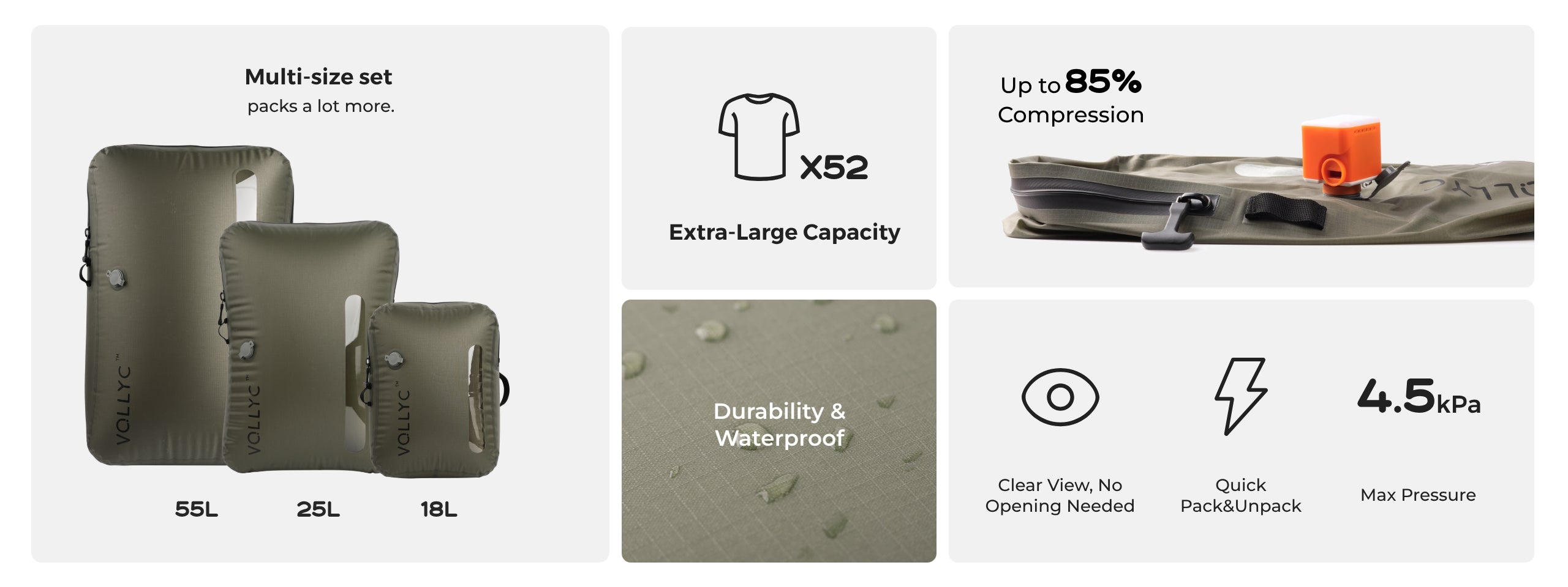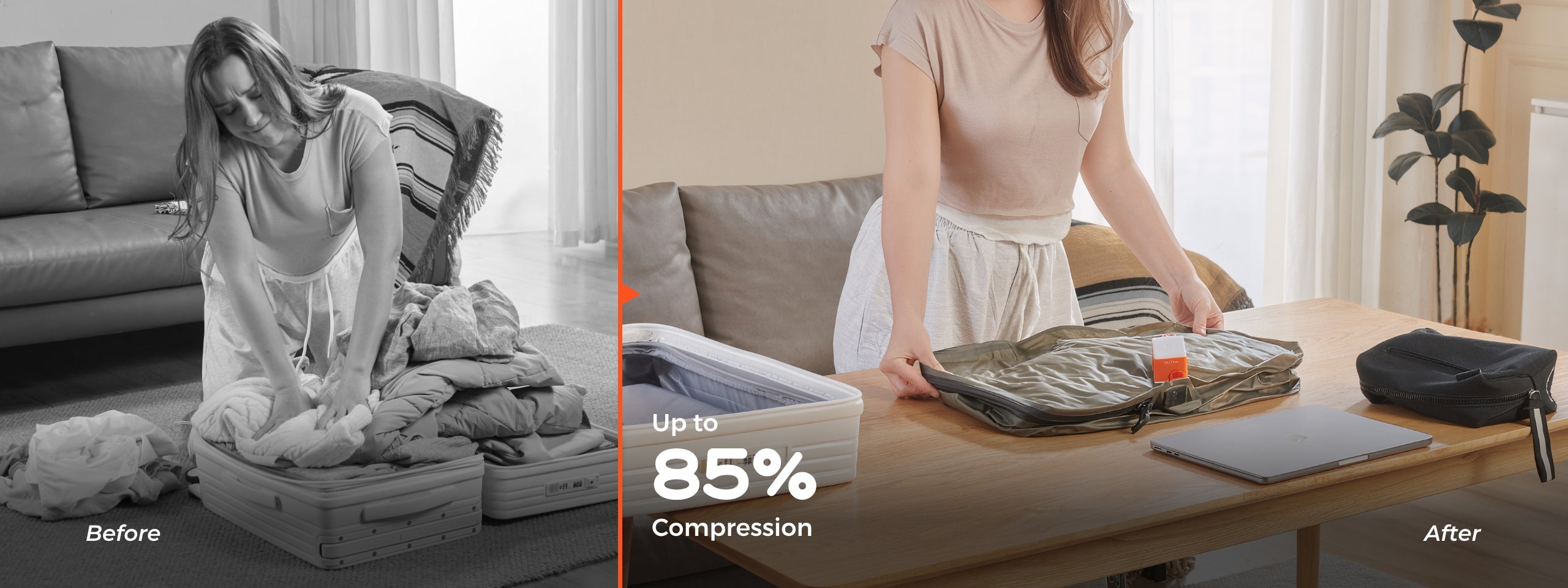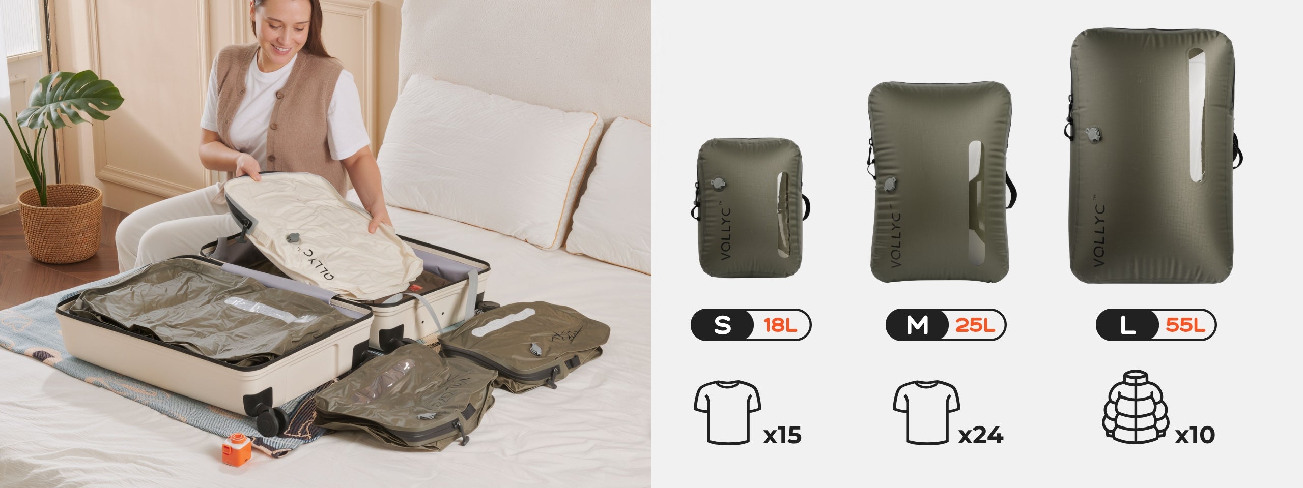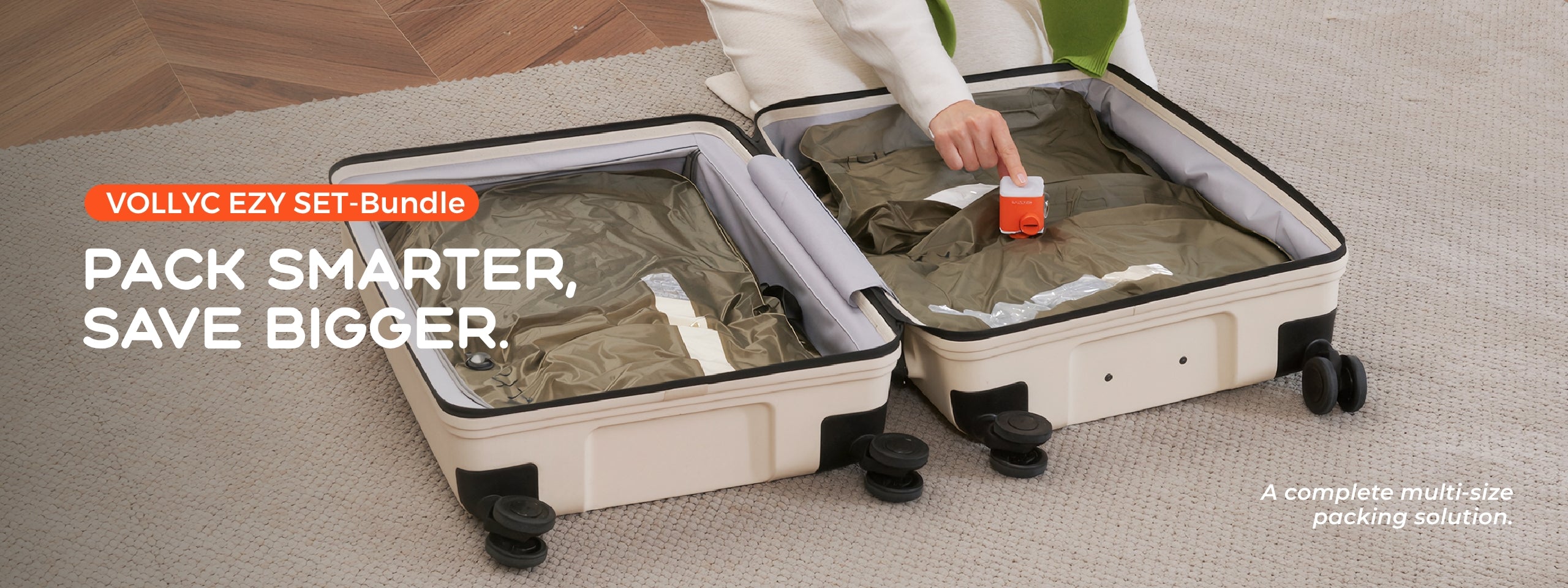 VOLLYC EZY SET's innovative design compresses your luggage by up to 85%, giving you three times more storage space.