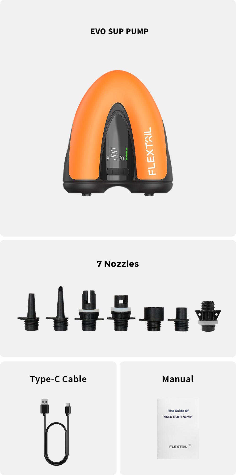 EVO SUP PUMP is an all-in-one cordless electric pump! It is compatible with almost any iSUP Board, Boat, Kayak, KITE, or air mattress! One pump is enough for all your inflatables. Make your travel easier.