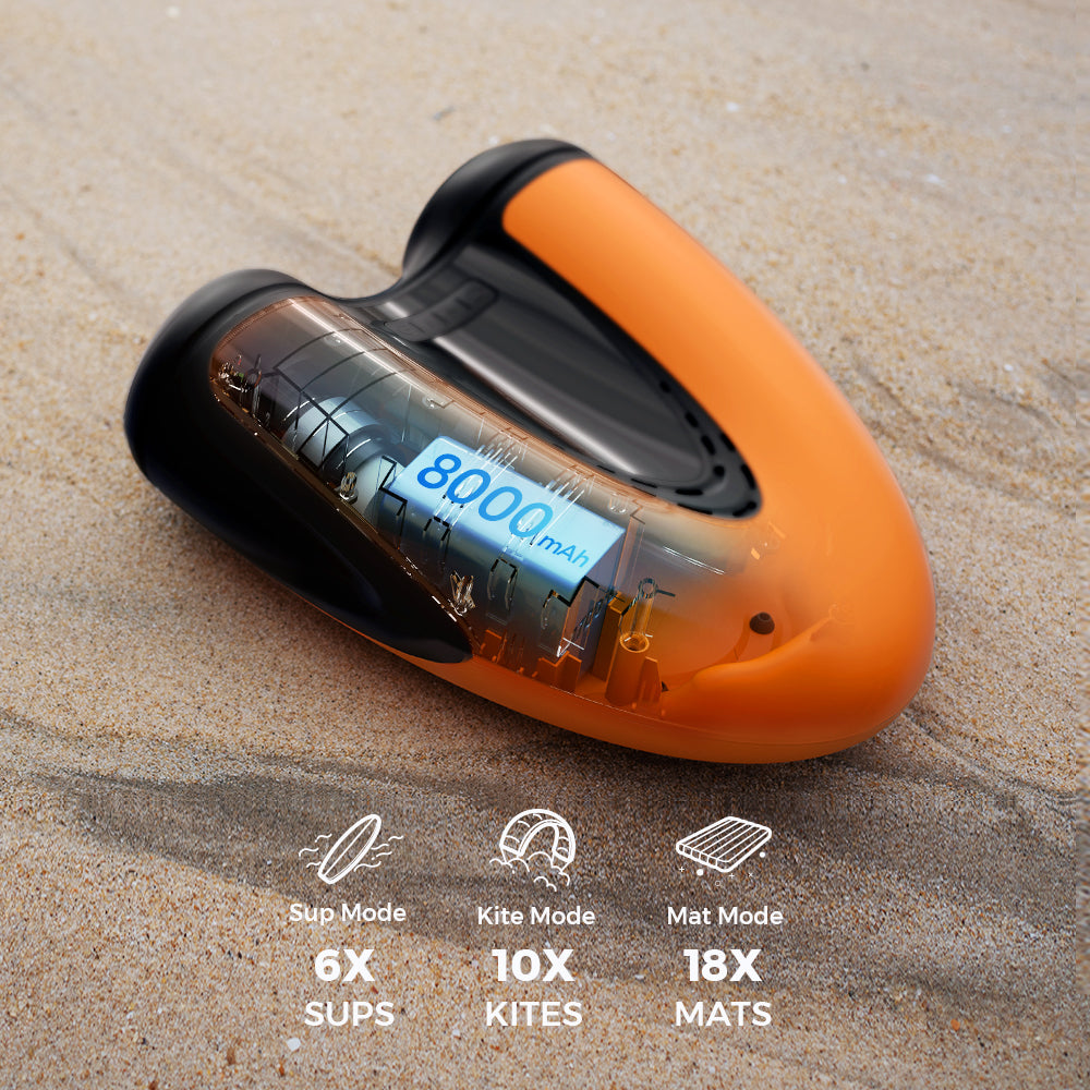 EVO SUP PUMP (MAX SUP PUMP upgraded quality) weighs only 3.76 Lbs (1.68kg), With a 8000mAh built-in battery, you can forget all the hassles from tangling cords. The hidden handle won’t take up extra space and allows you to carry it more easily. With its streamlined look and bright orange color, it will be your coolest partner.