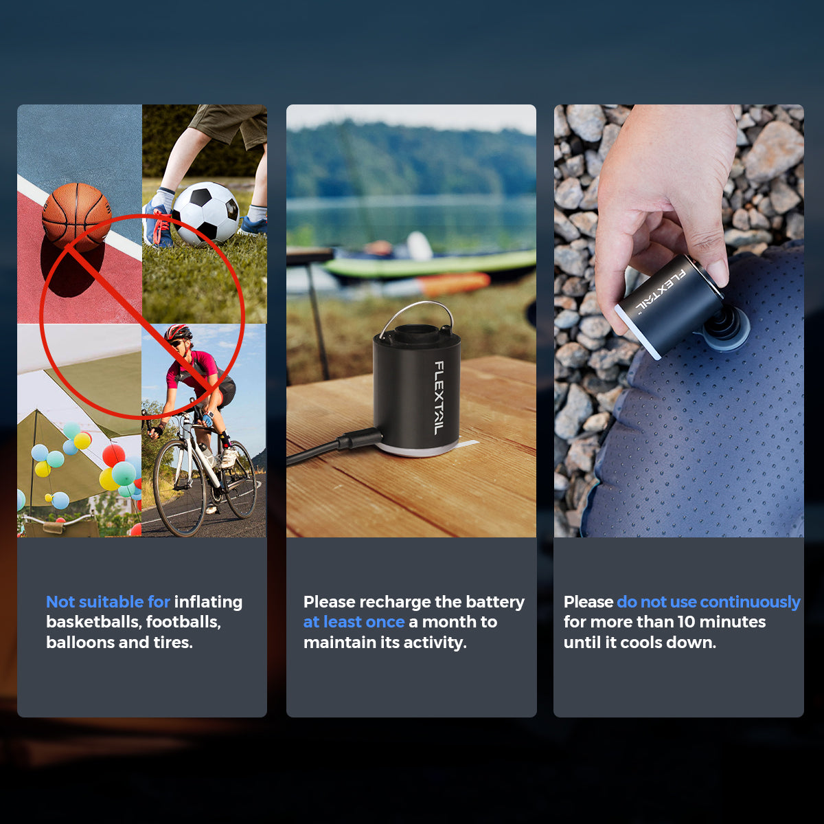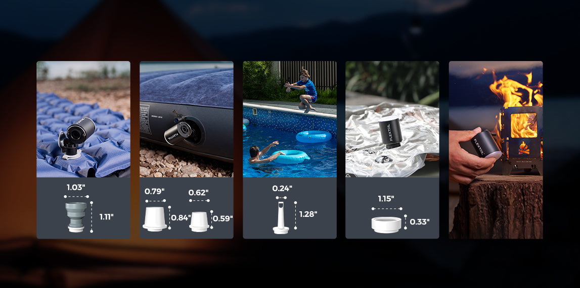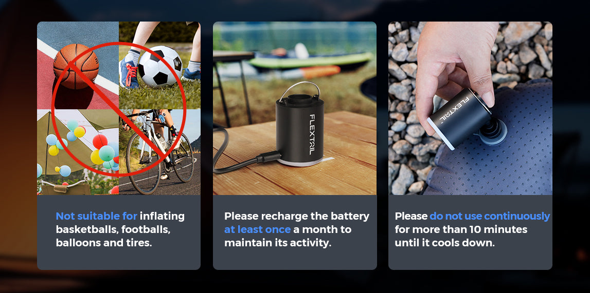 The 4kPa air pressure and 180L/min wind speed allow FLEXTAIL's tiny air pump to achieve rapid inflation or deflation. Well saturation function after inflation. Able to inflate 12 swim rings, 10-15 camping sleep pads, 1-2 thick air cushions, or deflate 15- 20 storage bags after one charging.