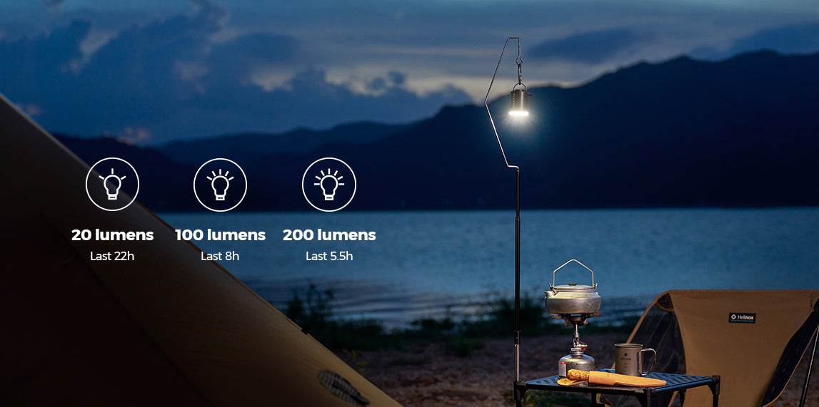 Hold on for three seconds to turn on. The three brightness (200 lumens / 100 lumens / 20 lumens) settings offer the desired light wherever you go, and the illumination can last up to 22 hours.