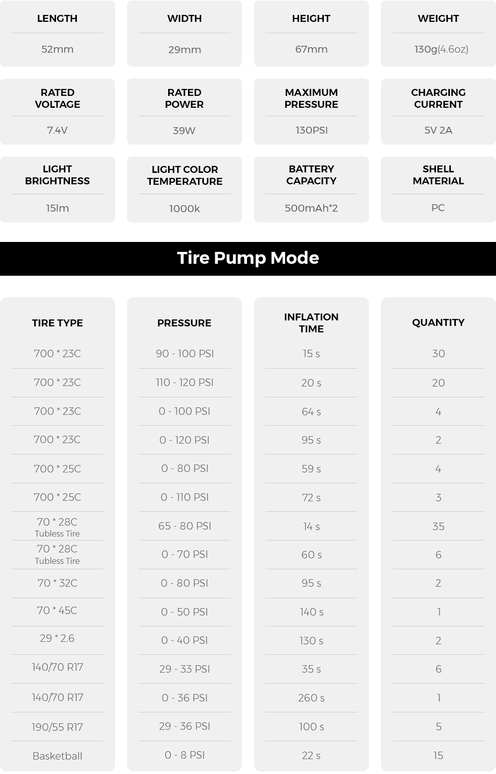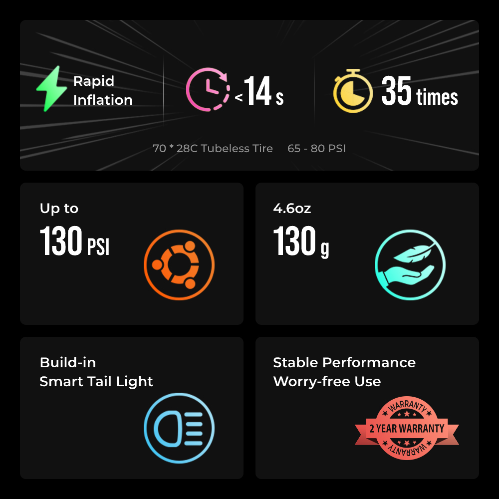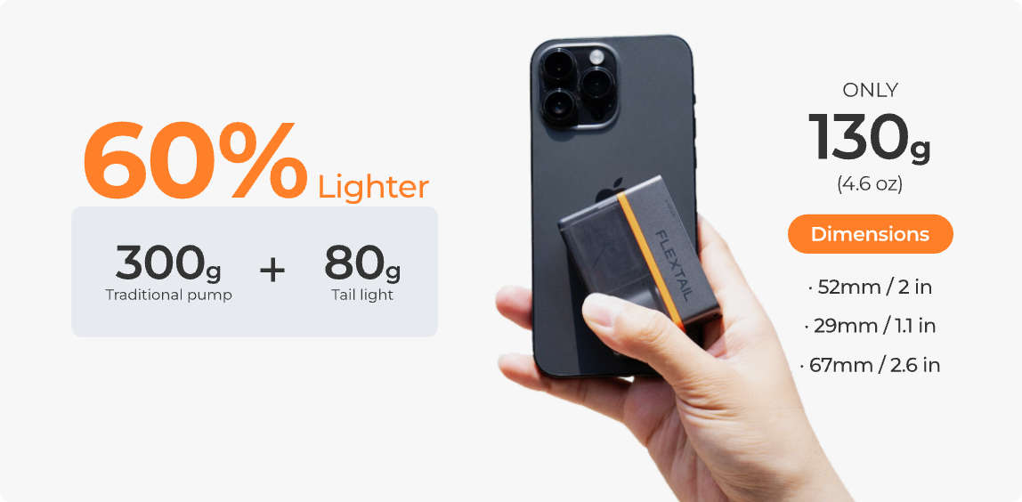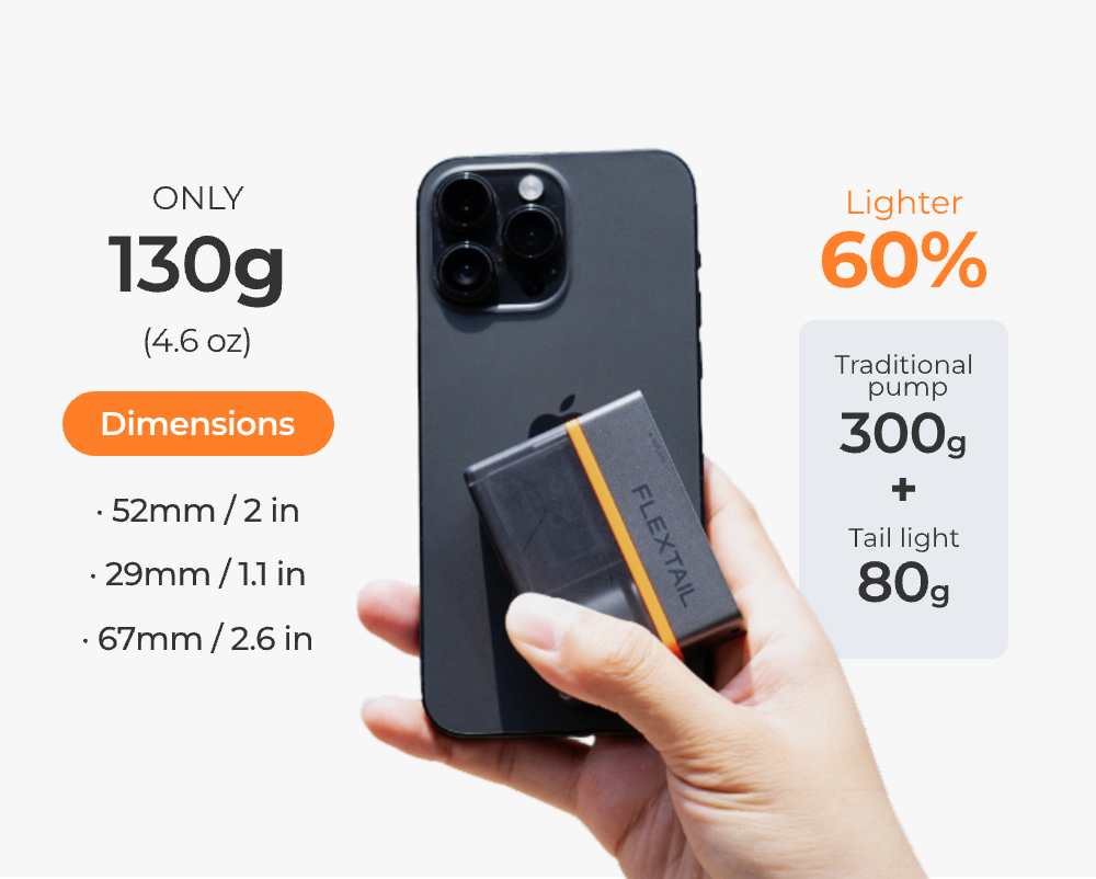 Despite its powerful performance and rich features, we have successfully reduced the weight of the Tiny Tire Pump 200 to an astonishing 130g.