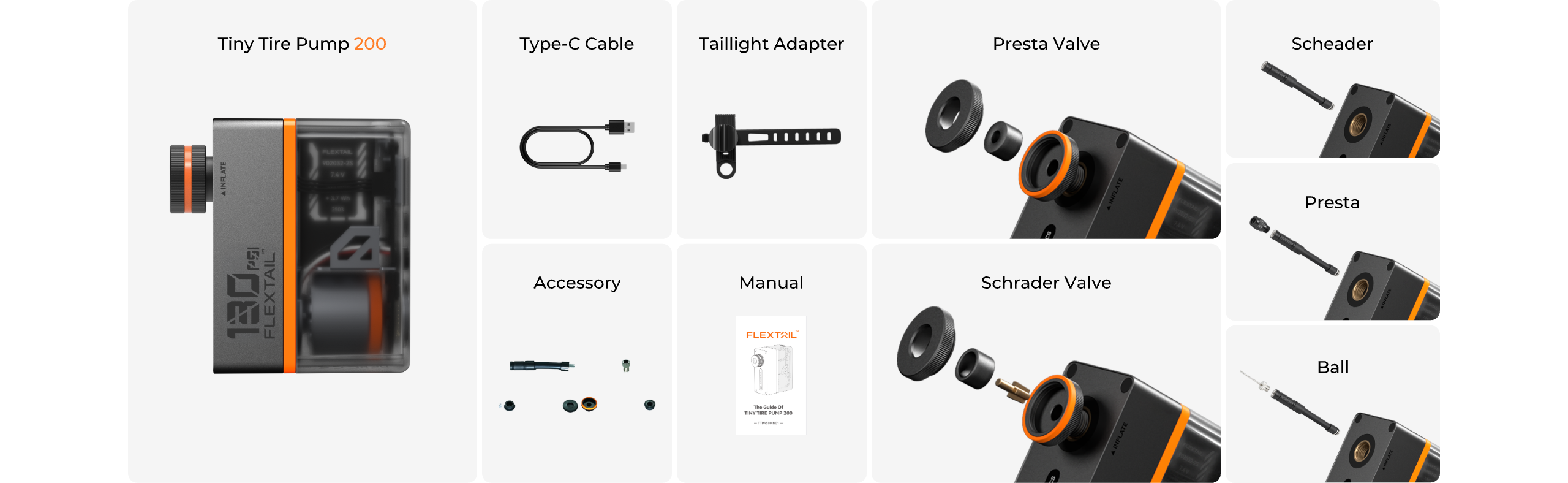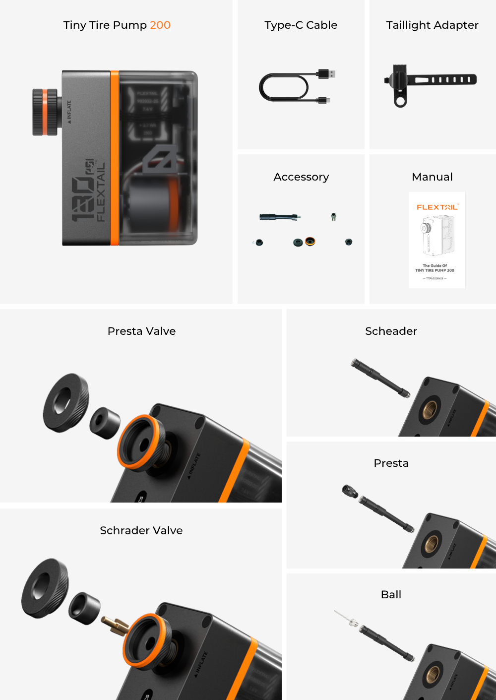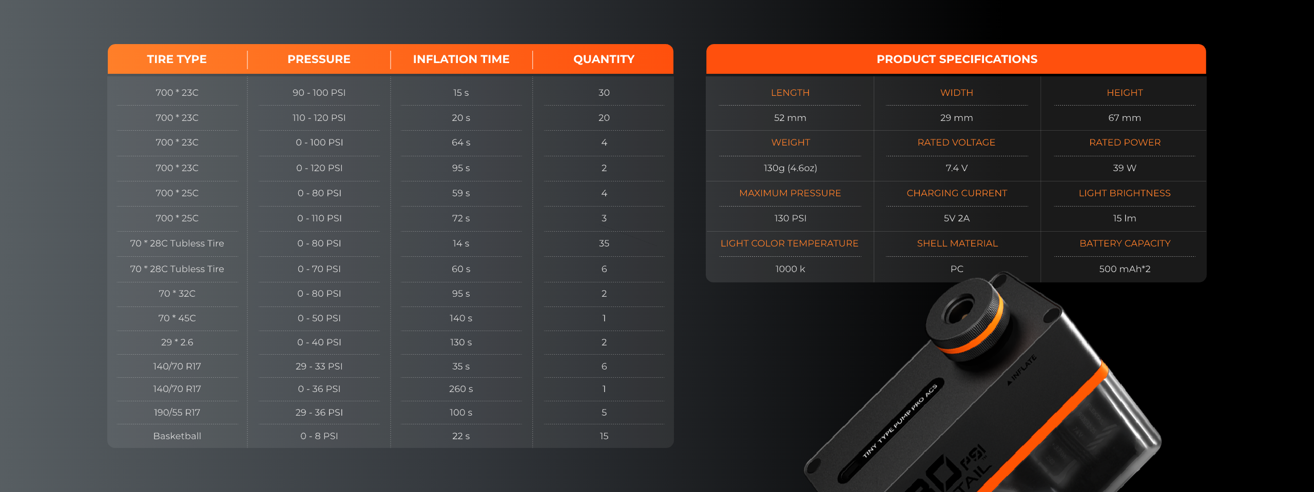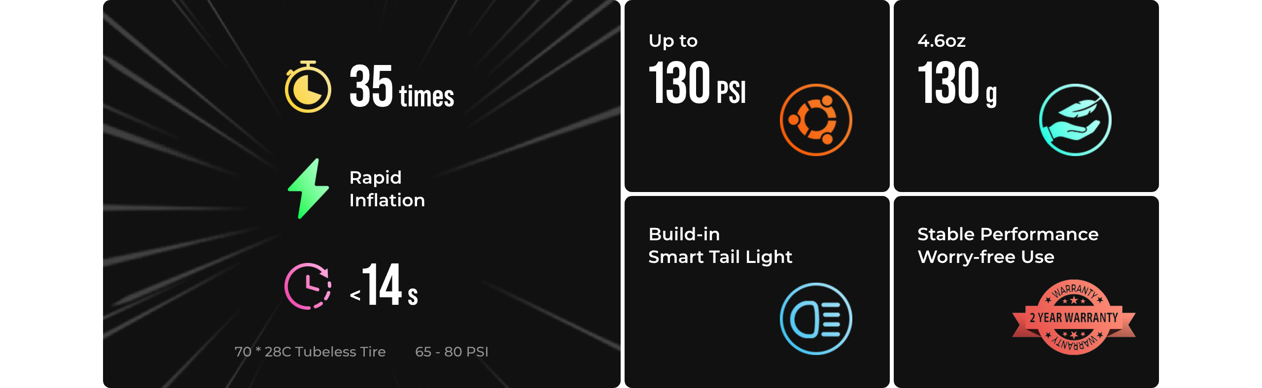 Despite its powerful performance and rich features, we have successfully reduced the weight of the Tiny Tire Pump 200 to an astonishing 130g.