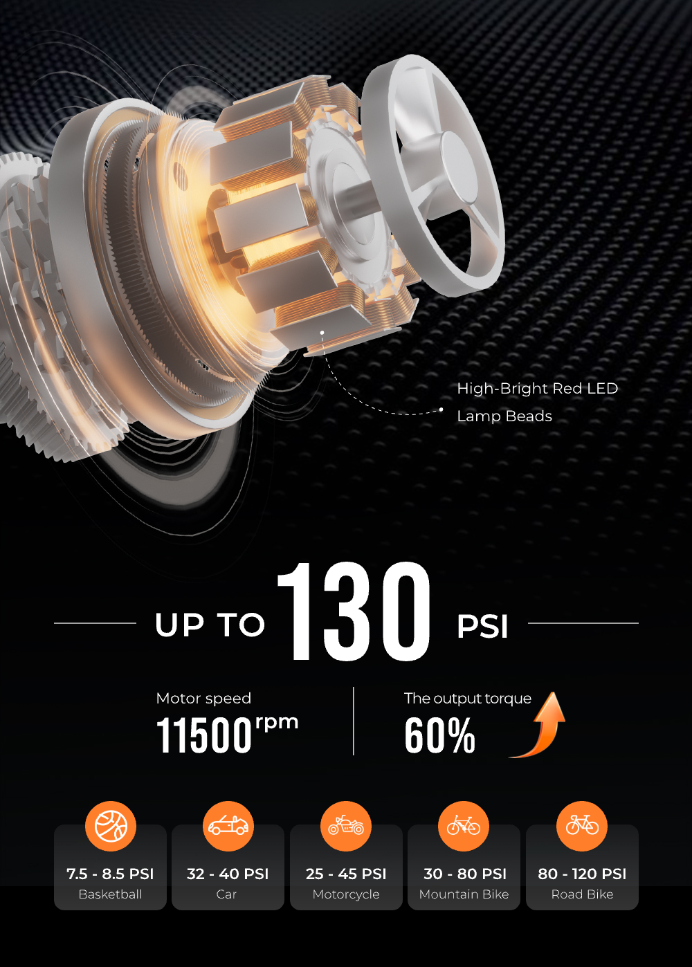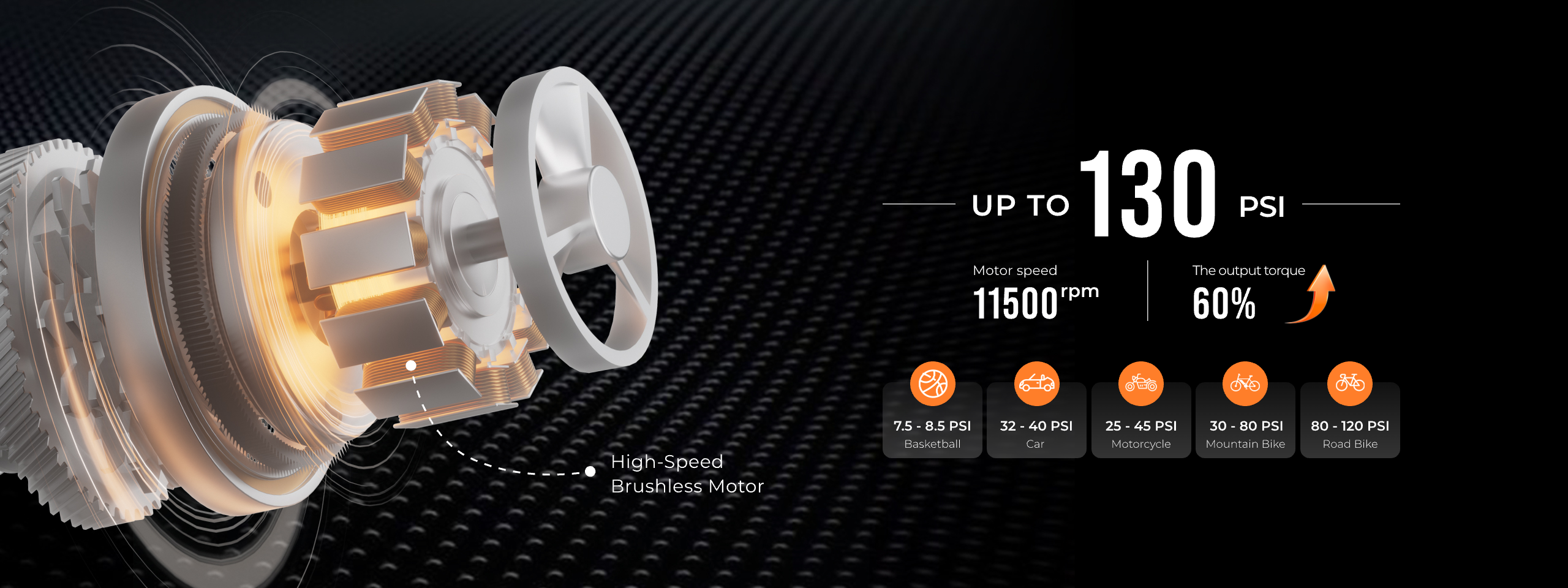 Powered by a precision brushless motor and a short-stroke, large-bore piston, the Tiny Tire Pump 200 can hit 130 PSI. Less friction, more efficiency, and way fewer breakdowns—this is pro-level inflation, built to perform.