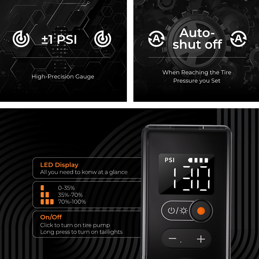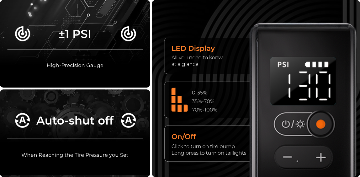 With the product's LED digital display screen and many thoughtful features, you can control tire pressure more accurately and enjoy a more professional and easier inflation experience.