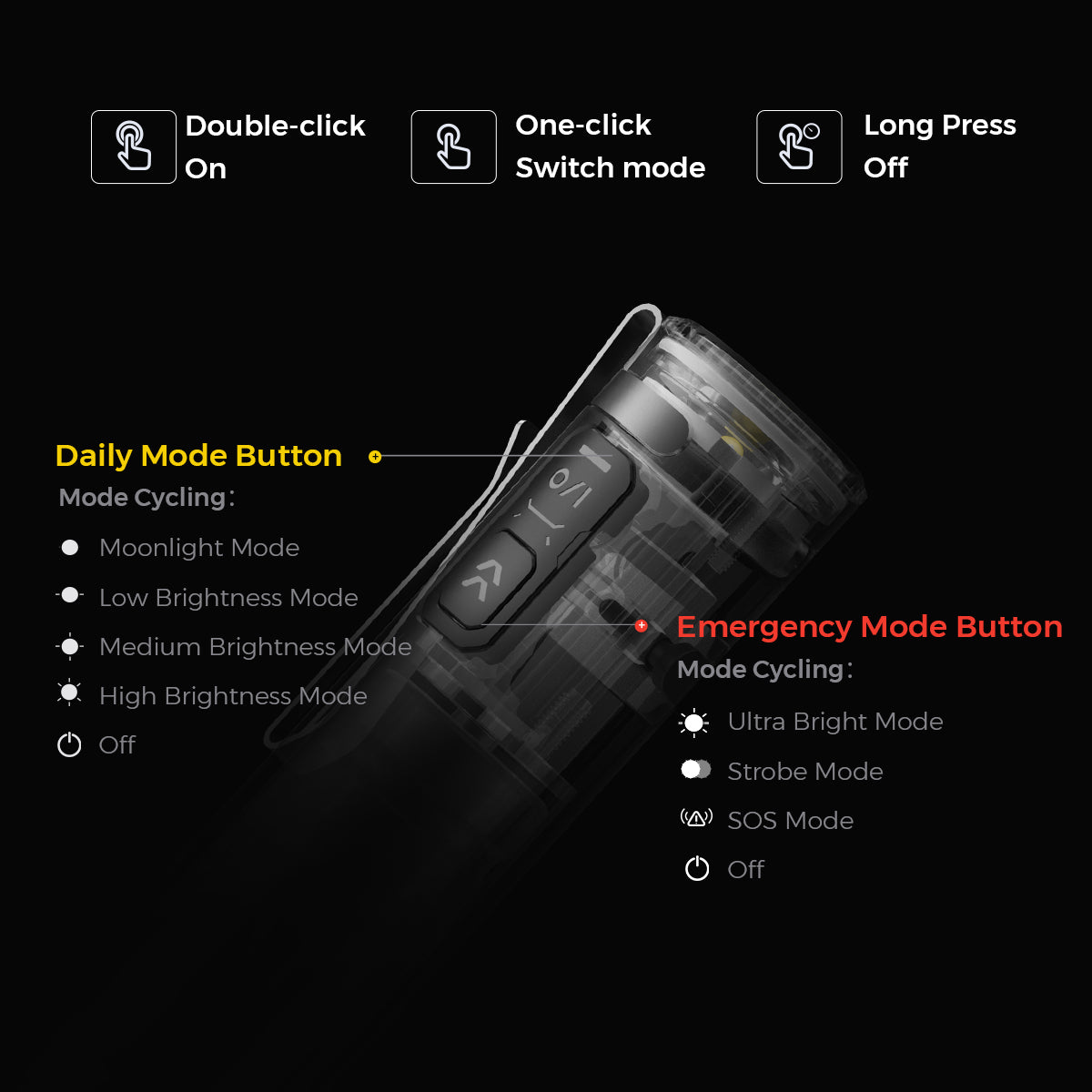 The dual-button mode makes the operation of Zero Flashlight very convenient, the operation mode is double-click to turn on and click to switch gears. When reactivated, the flashlight will automatically access the previous memorized brightness level.