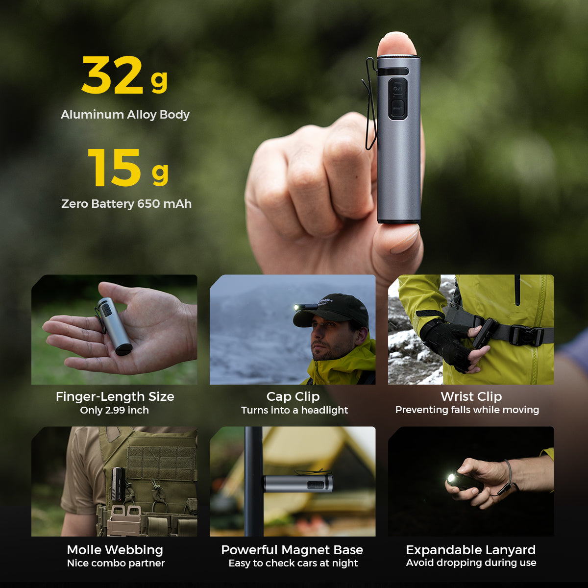 Packed with multiple features yet surprisingly lightweight, this Zero Flashlight weighing at just 1.65 oz(battery included) is perfect for storing in the pocket during everyday carry, it can also be clamped on a cap or wrist with its dual clip.